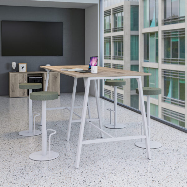 Featuring a distinctive overframe design, these tables offer the flexibility of both dining and poseur heights, making them ideal for a variety of settings, from casual breakout areas to formal meeting rooms.