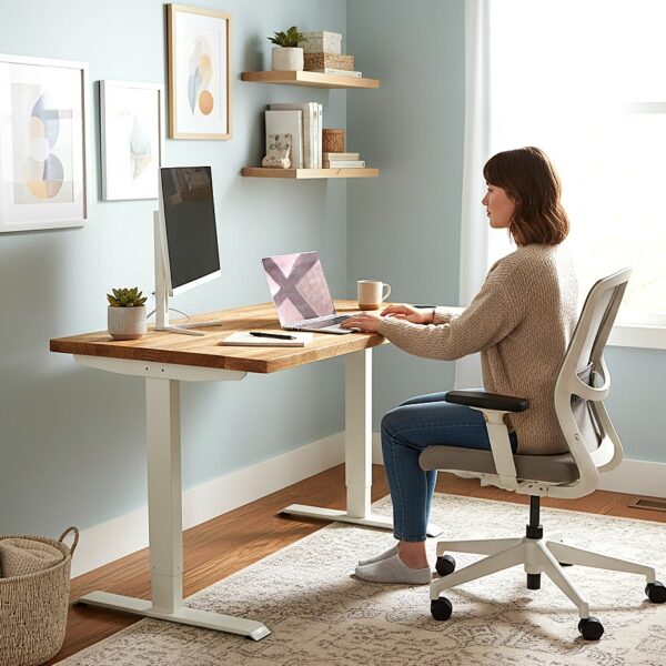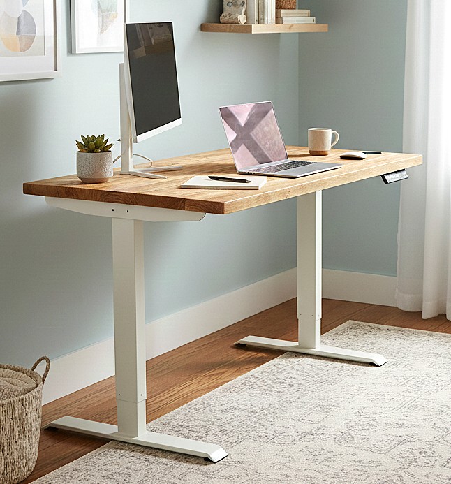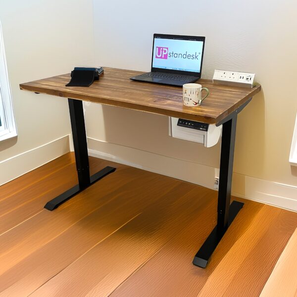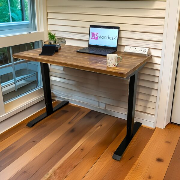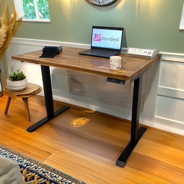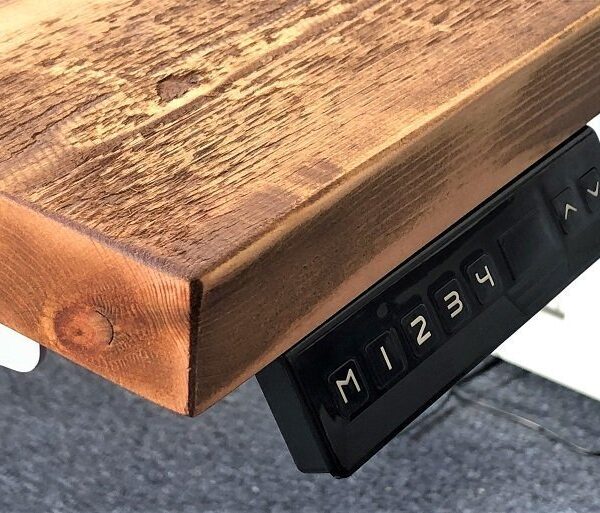 Rustic Pine wood electric standing desk is a healthier way to work and enables the user to easily adjust the height of the desk with a touch of a button.